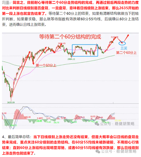 3、同时,当下还是指数的末尾段,不要涨了一天就冲昏头。接下来一周就是指数最后的冲刺,其目标是完成一个15分的走势结构,并且最终形成60分级别的盘背,这样日线、60分和15分三个级别就会出现所谓的区间套,也就是本轮2635开始日线级别上涨的终点。之后的调整时间就会比较长了,估计会持续至少2~3个月,那就等之后再分析了。