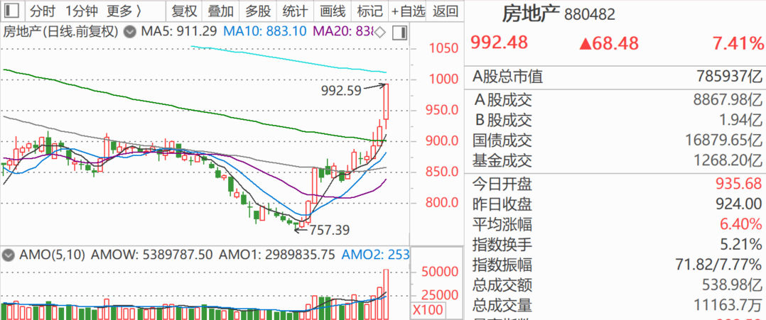 瞬间,市场又激动起来,房地产指数暴涨7.41%,24只房地产股涨停。