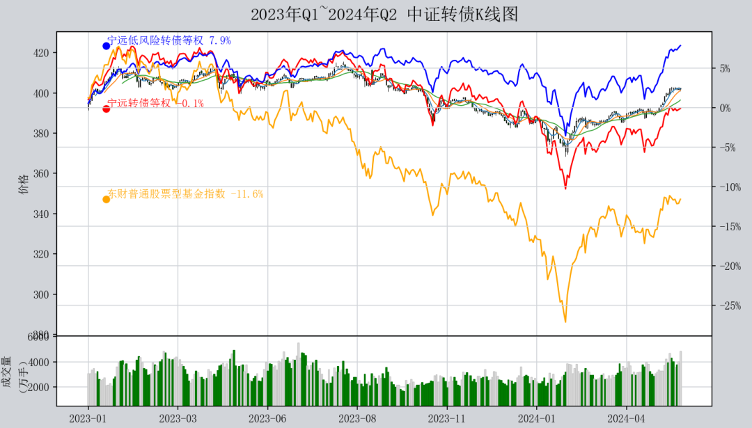 结合2023年,上证指数下跌3.7%,东财普通股票型基金指数大跌12.03%,中证转债小跌0.47%,宁远转债等权指数小涨0.66%考虑,中证转债和宁远转债等权指数在总体上还是不错,在回撤控制上尤其优秀。