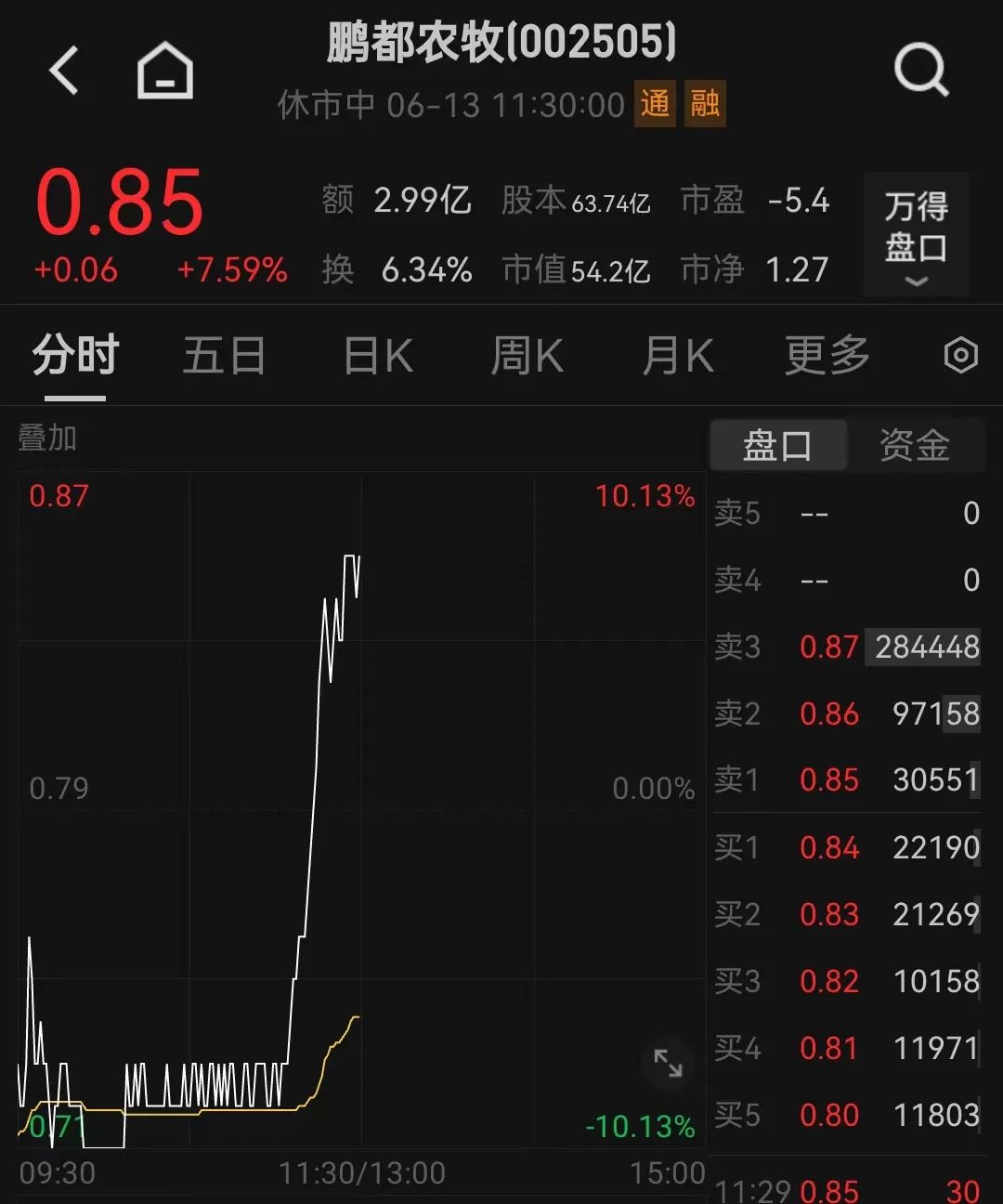 鹏都农牧于9点54分触及跌停板,10点06分左右被大笔买单撬板。临近午间收盘,鹏都农牧直线拉升,直逼涨停。