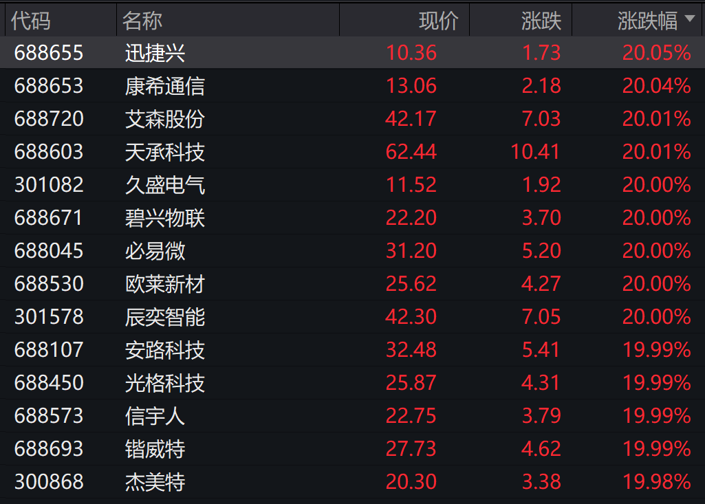 截至午间收盘,艾森股份、康希通信、碧兴物联、锴威特等10余股均20CM涨停,信宇人、欧莱新材、爱科赛博、光格科技等涨超10%。