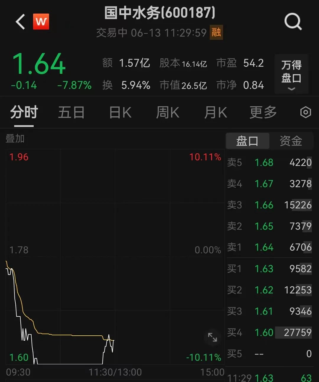 国中水务开盘之后快速下挫,10点左右被摁在跌停板上。临近午间收盘,突然大笔买单撬板,跌幅收窄至8%以内。