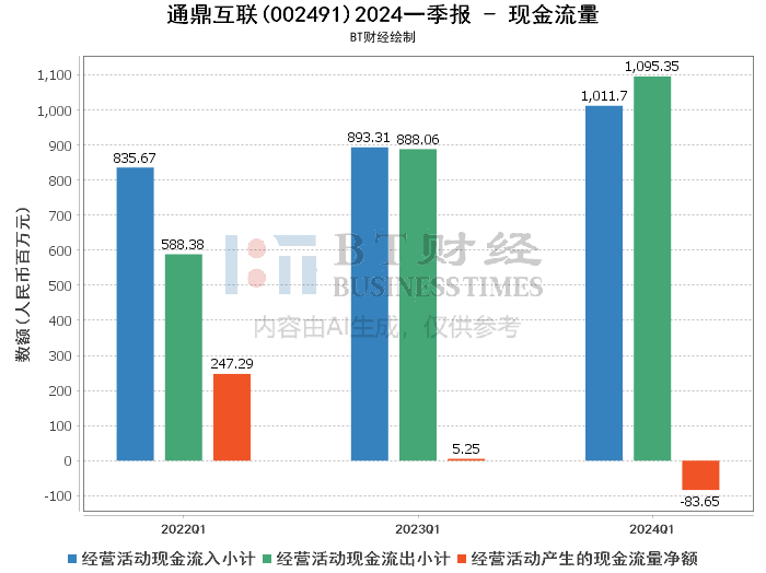 现金流量数据方面,通鼎互联在2024年一季度的经营活动产生的现金流量净额为-83.65百万元,而上年同期为5.25百万元,降幅达1,693.18%。经营活动现金流入小计为10.12亿元,较上年同期的8.93亿元有所增加,但现金流出小计也从上年同期的8.88亿元增加至10.95亿元。这表明公司在经营活动中面临较大的资金压力,需要进一步优化现金流管理。