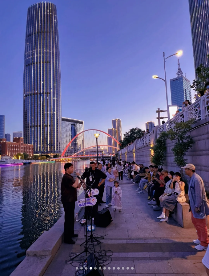 现在则有了,解放桥边席地而坐的野生演唱会、五大道上说走就走的city walk、海河游船上与浪漫的邂逅。