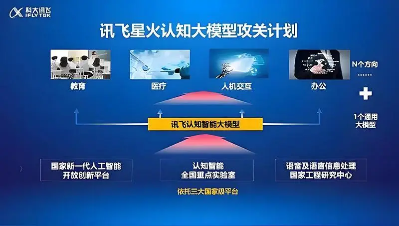 2022年12月,科大讯飞启动“1+N认知智能大模型技术及应用”专项攻关,其中“1”代表通用认知智能大模型底座,“N”代表将认知智能大模型技术应用在教育、医疗、汽车、办公、智能硬件等多个行业领域,并形成独具优势的行业专用模型。