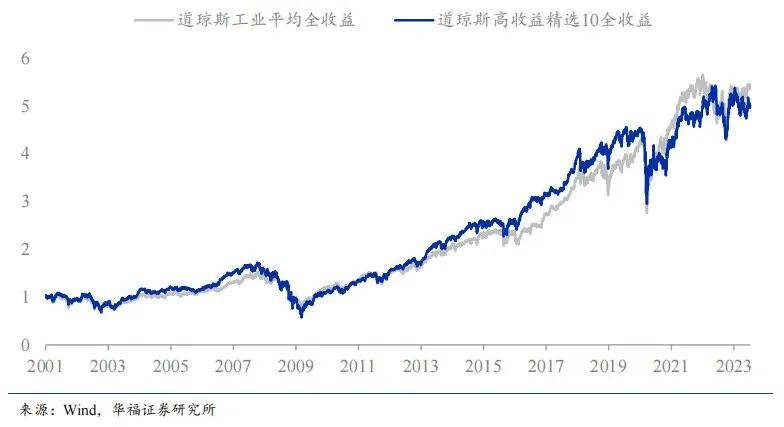 数据来源:Wind,华福证券研究所《高股息策略探讨》。统计区间:2001.01.01-2023.06.30;注:道琼斯高收益精选10全收益指数为从道琼斯工业平均指数里选取的年化股息生息率最高的10家企业。