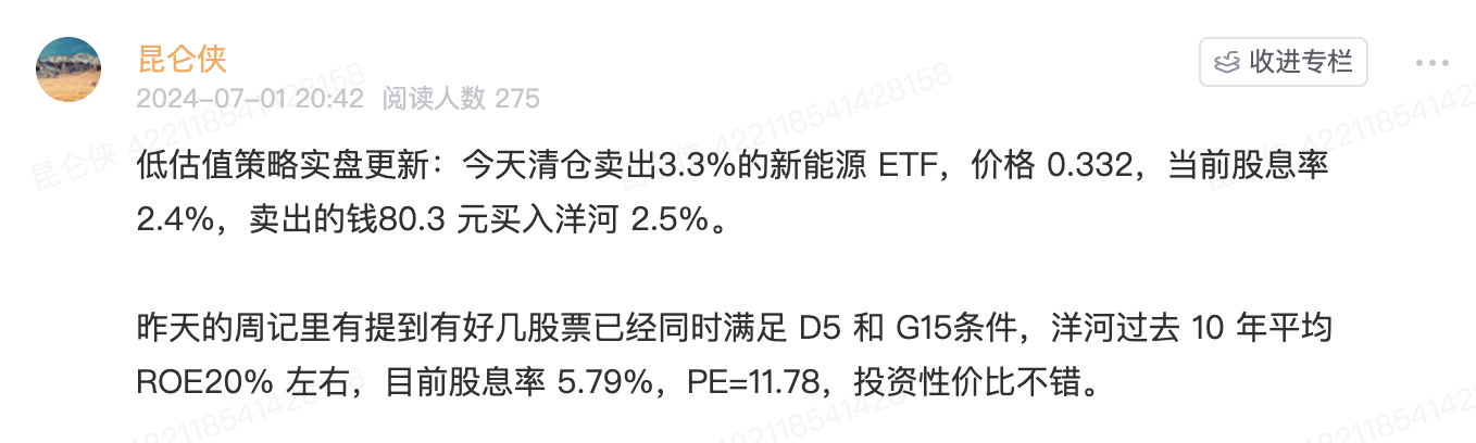 本周一清仓卖出3.3%的新能源 ETF,价格 0.332,当前股息率 2.4%,卖出的钱80.3 元买入洋河 2.5%。