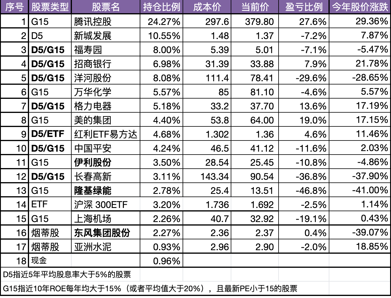 上周的周记里有提到有好几股票已经同时满足 D5 和 G15条件,洋河过去 10 年平均 ROE20% 左右,周一买入时股息率 5.79%,最新股息率 5.94%,PE=11.5,投资性价比不错。
