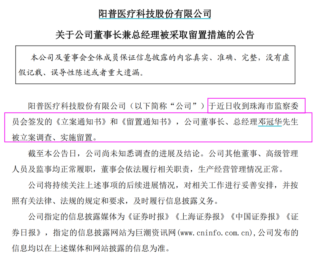 时隔三个月,这家上市公司董事长再次被立案调查! 7月8日早间,阳普医疗公告,公司董事长兼总经理邓冠华被珠海市监察委员会立案调查并实施留置。