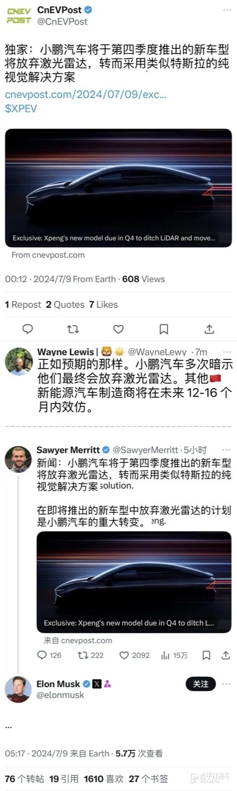 据太平洋汽车报道,近期有博主爆料称,小鹏汽车计划在第四季度推出的新车型F57将放弃激光雷达,采用类似特斯拉的纯视觉智能辅助驾驶解决方案。对此,特斯拉CEO马斯克在评论区简单回应“...”,不明确其意是无语还是已知情。