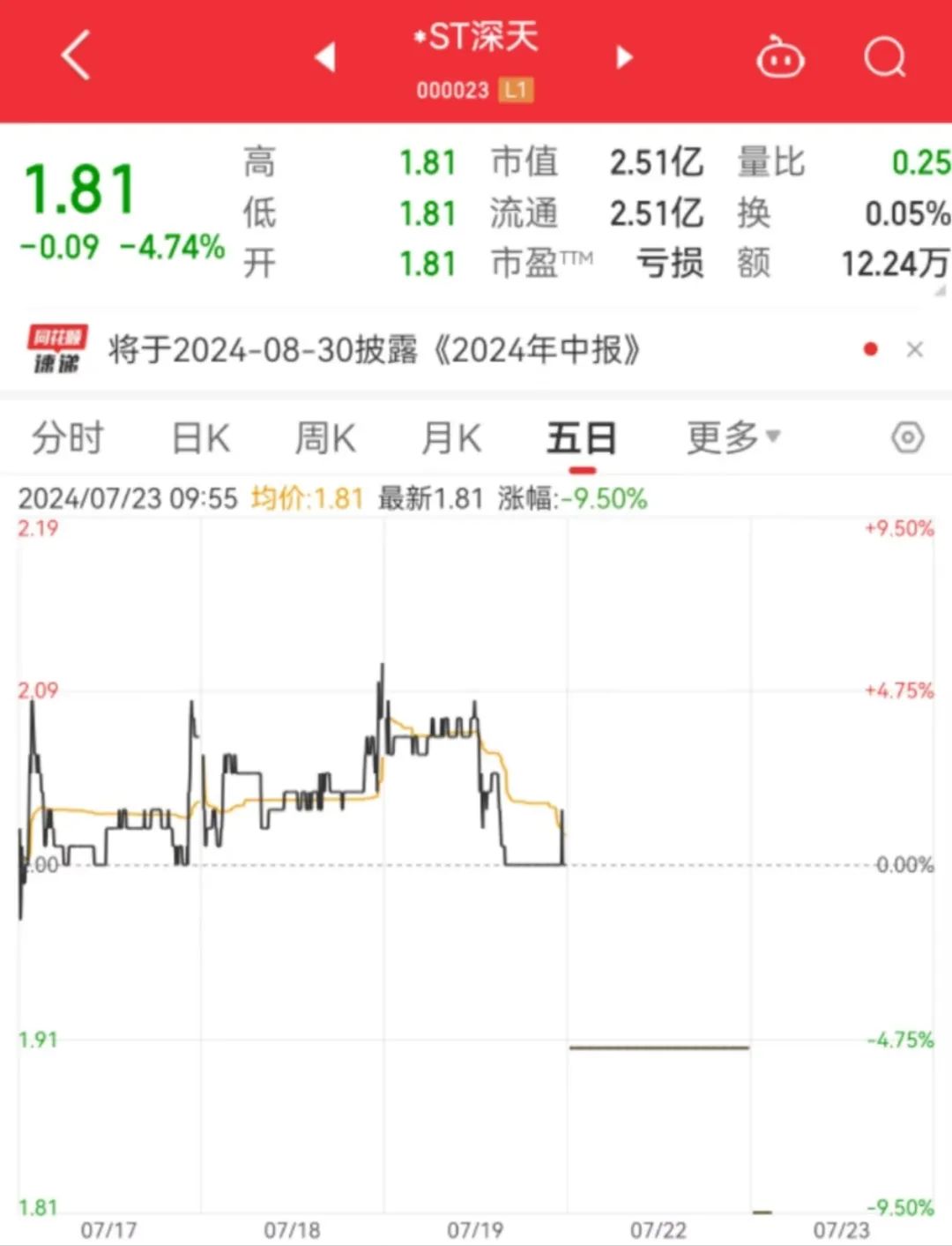 *ST深天一字跌停 锁定市值退市 *ST深天再度跌停,公司股价报1.81元/股,总市值为2.51亿元,这已是公司连续第19个交易日收盘市值低于3亿元。 即便接下来的一个交易日涨停,公司市值也无法突破3亿元的门槛。这也意味着公司股票收盘市值将连续20个交易日低于3亿元,满足市值退市的条件。如果*ST深天因此退市,将成为史上首个A股公司市值退市案例。