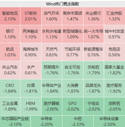 盘面上,智能物流、ST等板块涨幅居前;半导体、光刻机、生物医药概念股跌幅居前。