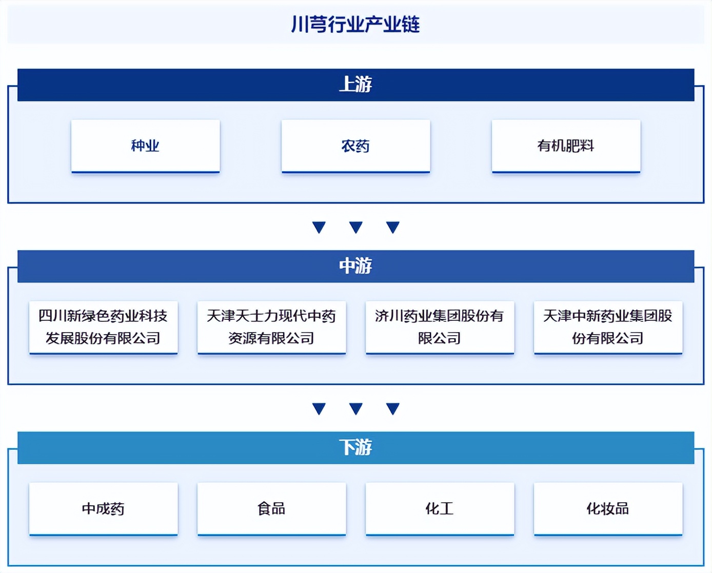 我国川芎行业产业链涵盖上游的种业、农药和有机肥料供应,中游的川芎种植与加工企业,以及下游的多元化应用领域。上游产业链主要为川芎种植提供种子、农药和有机肥料等生产资料,确保川芎种植的质量和产量。中游则是川芎种植和加工的核心环节,由多家知名企业如四川新绿色药业科技发展股份有限公司、天津天士力现代中药资源有限公司等引领,拥有先进的种植技术和加工设备,还致力于提升川芎的品质和价值。下游则涉及中成药、食品、化工和化妆品等多个领域,川芎的药用价值和健康功效在这些领域得到广泛应用,拓宽了川芎产业链的发展空间。