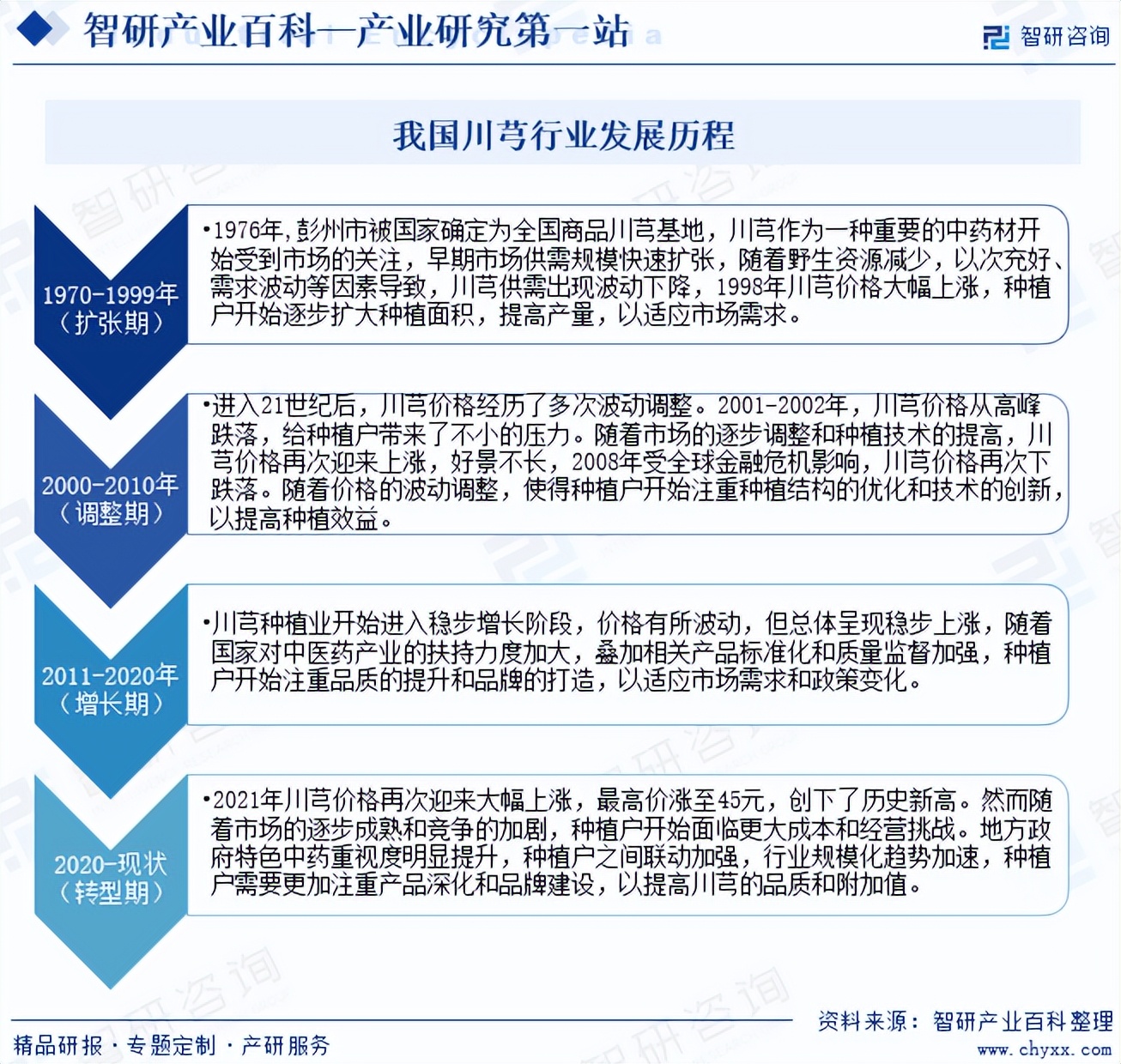 我国川芎种植发展历程经历了从快速扩张到波动调整,再到稳步增长,最终进入转型期的演变。自1970年代起,彭州市成为全国商品川芎基地,川芎市场供需规模迅速扩大。然而,随着野生资源的减少和市场需求的波动,川芎价格经历了起伏不定的阶段。进入21世纪后,种植户面临价格波动的压力,开始注重种植结构的优化和技术创新。随着国家对中医药产业的扶持力度加大,川芎种植业在2011年至2020年间进入稳步增长期,价格总体呈现上涨趋势,品质提升和品牌建设成为种植户关注的焦点。2021年川芎价格创历史新高,但种植户也面临成本上升和市场竞争加剧的挑战。当前行业正加速规模化发展,种植户需深化产品加工和品牌塑造,以提升川芎的附加值和市场竞争力。