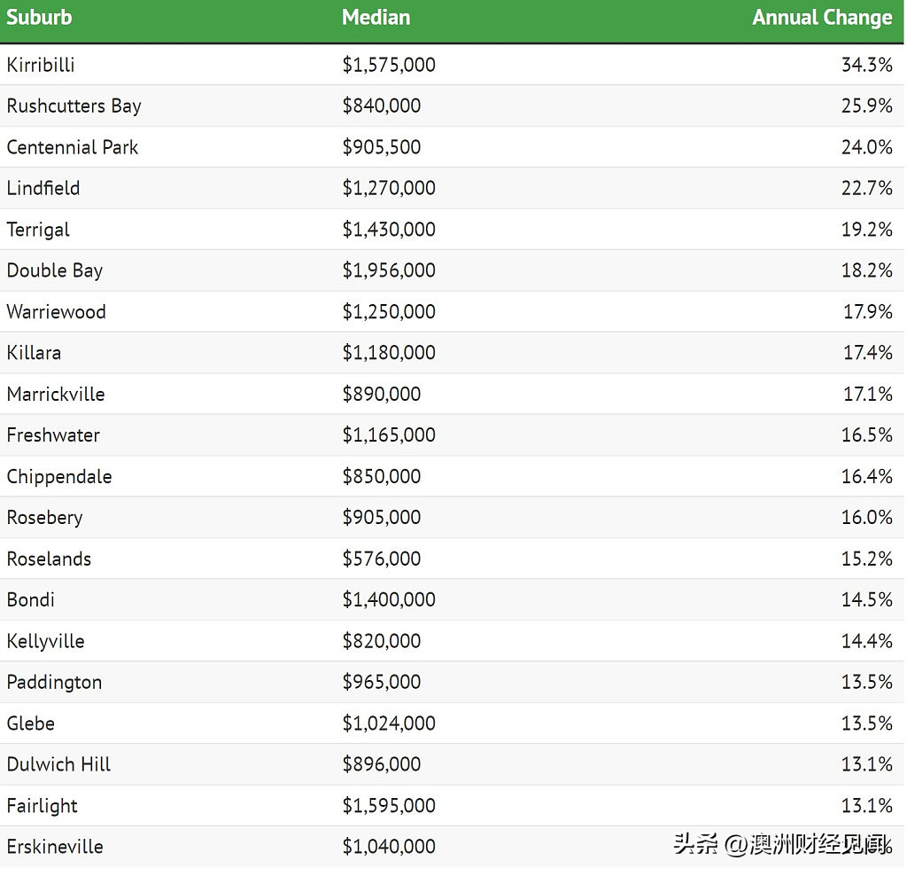 紧随其后的分别为Glebe、Fairlight、Marsfield及Berala,涨幅在24.2%到33.2% 不等。此外,华人区Chatswood也榜上有名,涨幅达到了20.3%。 而在单元房方面,涨幅第一的是Kirribilli,过去12个月内上涨了34.3%,中位价 达到了157.5万澳元。