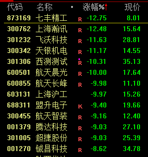 下跌方面,商业航天、教育等近期市场热点板块集体退潮。其中航天晨光、上海沪工、中公教育、昂立教育跌停。