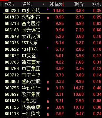 大消费板块反弹,中央商场、永辉超市涨停。