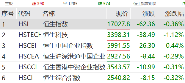 港股市场早间小幅高开:恒生指数涨0.07%,恒生科技涨0.04%,恒生国企涨0.13%。上午港股走低,三大指数集体飘绿,恒生科技跌超1%;哔哩哔哩领跌恒生科技。