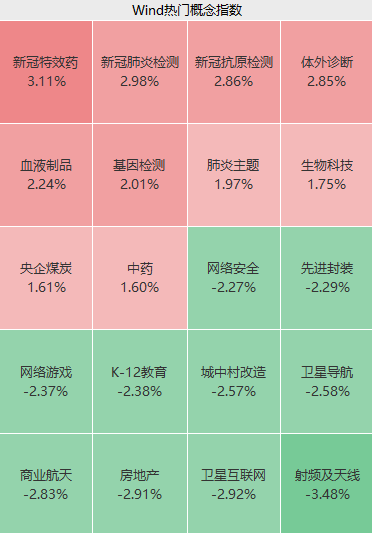 盘面上,上午环保股大涨,生物科技走高,新冠特效药相关概念走红。教育板块走低,房地产、餐饮旅游、零售等不振。