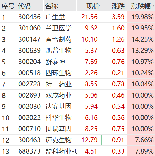 消息面上,8月11日,中共中央、国务院印发的《关于加快经济社会发展全面绿色转型的意见》正式对外公布,这是中央层面首次对加快经济社会发展全面绿色转型进行系统部署。《意见》提出了两个阶段目标,围绕五大领域、三大环节,部署加快形成节约资源和保护环境的空间格局、产业结构、生产方式、生活方式。 银河证券研报提出,关注用能低碳化、耗能减碳化两大维度的投资机会。用能低碳化方面,化石能源清洁高效利用,火电转型有望迎来估值重塑;新能源政策日趋完善,行业成长空间巨大。耗能减碳化方面,高耗能行业节能降碳产品、装备、技术迎来发展契机,再生资源低碳属性打开新成长空间。 另外,上午医药生物板块震荡走高,新冠抗原检测、新冠特效药、体外诊断、血液制品、基因检测等细分概念涨幅居前。 个股方面,广生堂、兰卫医学20CM涨停,四环生物、特一药业、双成药业、达安基因等多股封住涨停板。