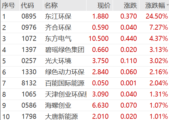 港股市场上,东江环保盘中大涨超30%,齐合环保、东方电气等走高。