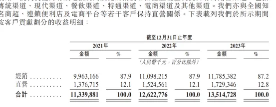 在销售渠道方面,华润饮料主要依赖经销模式。报告期间内,经销渠道产生的收入分别为99.63亿元、110.98亿元和117.85亿元,分别占总收入的87.9%、87.9%和87.2%。