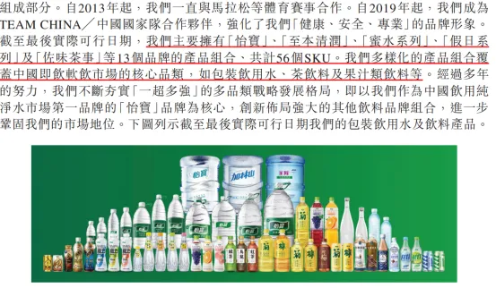 其实,怡宝早在几十年前就涉足饮料厂市场了,90年代就推出了“刺梨汁”等果汁饮品,但成效并不理想。根据招股说明书,华润饮料目前拥有“怡宝”、“至本清润”、“蜜水系列”、“假日系列”及“佐味茶事”等13个品牌的产品组合、共计56个SKU。公司产品涵盖包装饮用水、茶饮料和果汁类饮料等。