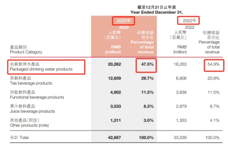 根据灼识咨询报告,“怡宝”品牌饮用纯净水在2023年的零售额达到395亿元人民币,是中国饮用纯净水市场的领先品牌。2023年,华润饮料在包装饮用水市场和饮用纯净水市场的份额分别为18.4%和32.7%。然而,在茶饮料、果汁类饮料、咖啡饮料等核心即饮软饮品类的市场份额中,华润饮料在中国市场的排名仅居前十位,远不及其饮用水产品的市场地位。相比之下,农夫山泉旗下的东方树叶、茶、水溶C100等产品已成为爆款单品,并为公司带来了显著的营收。
