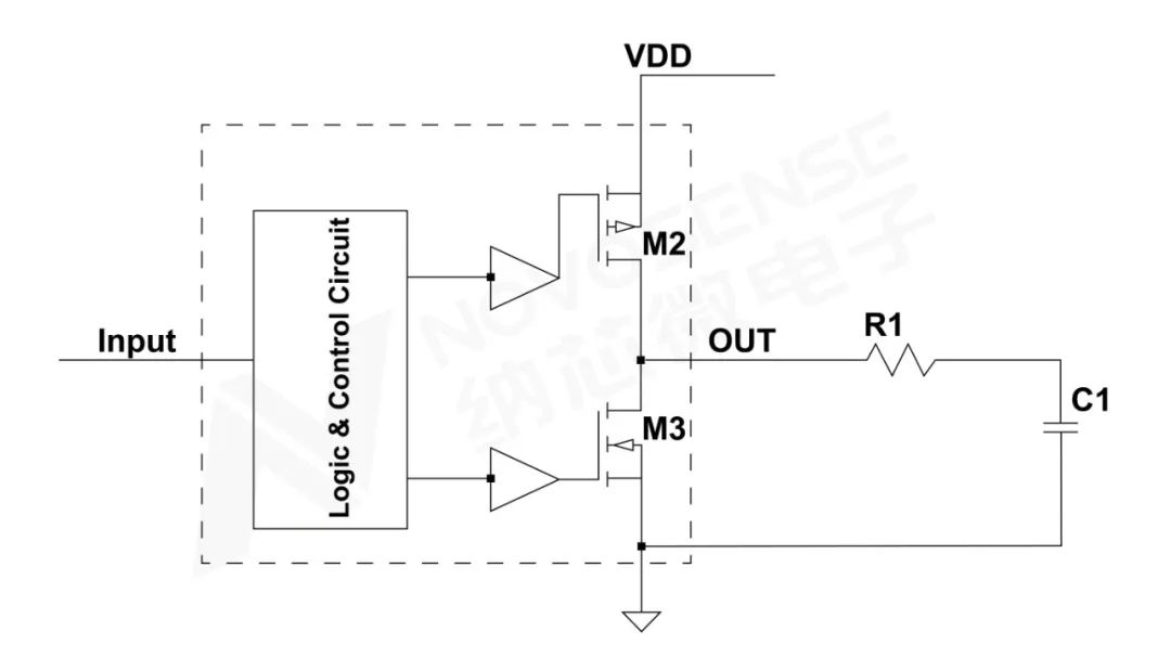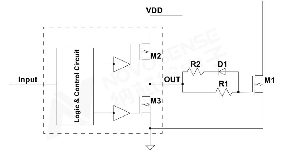 下图2所示,是一种常见的MOSFET驱动电路,虚线框内为一个输出通道的结构示意图,其输出采用PMOS+NMOS结构。驱动器在控制功率管MOSFET M1开通和关断时,会对功率MOSFET M1的栅极拉出和灌入电流。在窄脉宽开通情况下,驱动器收到关断指令会将MOSFET M1关断,此时MOSFET M1的开通过程还没有完成,驱动器的输出仍然维持在较高的电流,当该电流突然变化,在PCB走线寄生电感和驱动器内部寄生电感的共同作用下,会在驱动器的输出引脚产生很大的电压应力,该应力可能导致芯片失效。