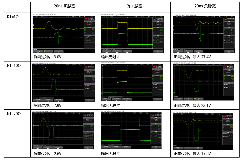 如上结果所示,当驱动电阻为1时,20ns的正向窄脉宽会导致-9V的负向过冲;同样,20ns的负向脉宽会导致27.4V的正向过冲,超过了芯片的额定值,会存在失效风险。正常脉宽下,OUT输出没有正负过冲现象。此外,还可以看出,在相同脉宽输入时,驱动电流越大,输出脚的正向或负向电压应力越高;因此减小驱动电流可以有效减小窄脉宽产生的正负过冲电压。