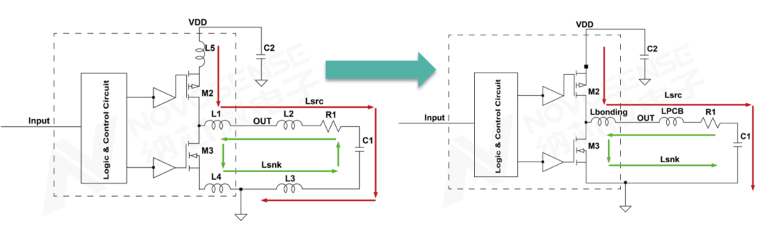 t2时刻,NMOS M3关断,PMOS3开通,OUT输出被拉高,此时驱动回路中电流Isnk不为零,该电流在芯片内部的寄生电感和PCB走线的寄生电感的共同作用下,对PMOS M2和NMOS M3的寄生输出电容进行充放电,导致OUT输出出现显著的正向过冲电压。