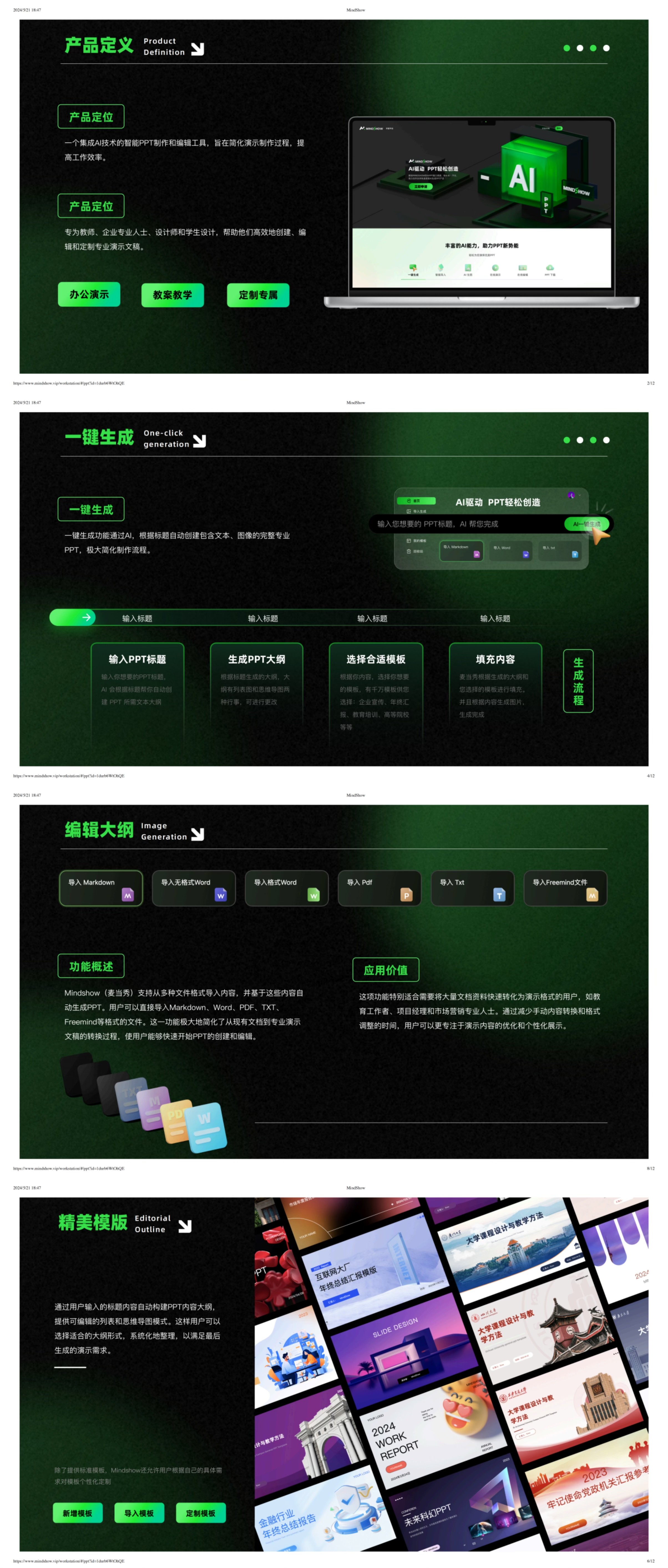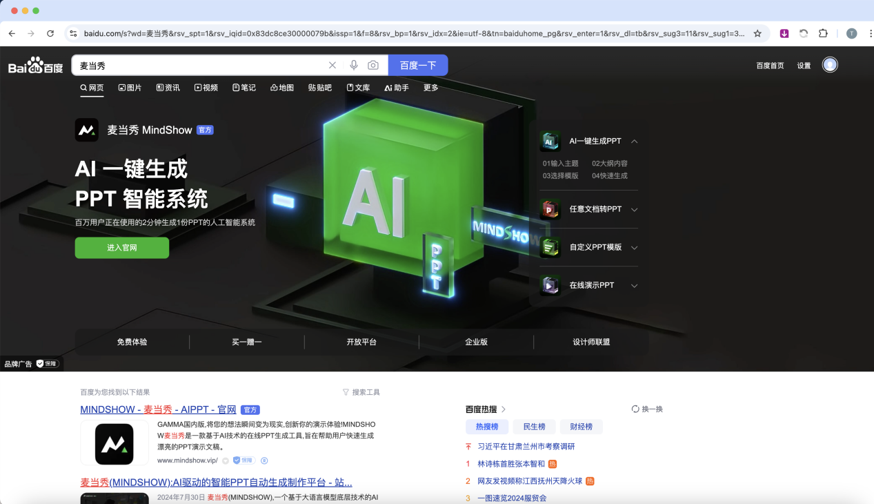 在短短的一年多内,麦当秀MindShow AiPPT实现了多个重要的里程碑:6月份量子位智库AI应用AI PPT类Web端访问时长排名第一;7月份参加WAIC世界人工智能大会并获得了广泛的认可;8月份荣登百度AI原生应用办公提效榜第一名;9月份用户数量更是突破近百万大关。在这激烈的竞争环境中,麦当秀作为AiPPT细分赛道的一匹黑马,展现出了令人瞩目的实力和潜力。