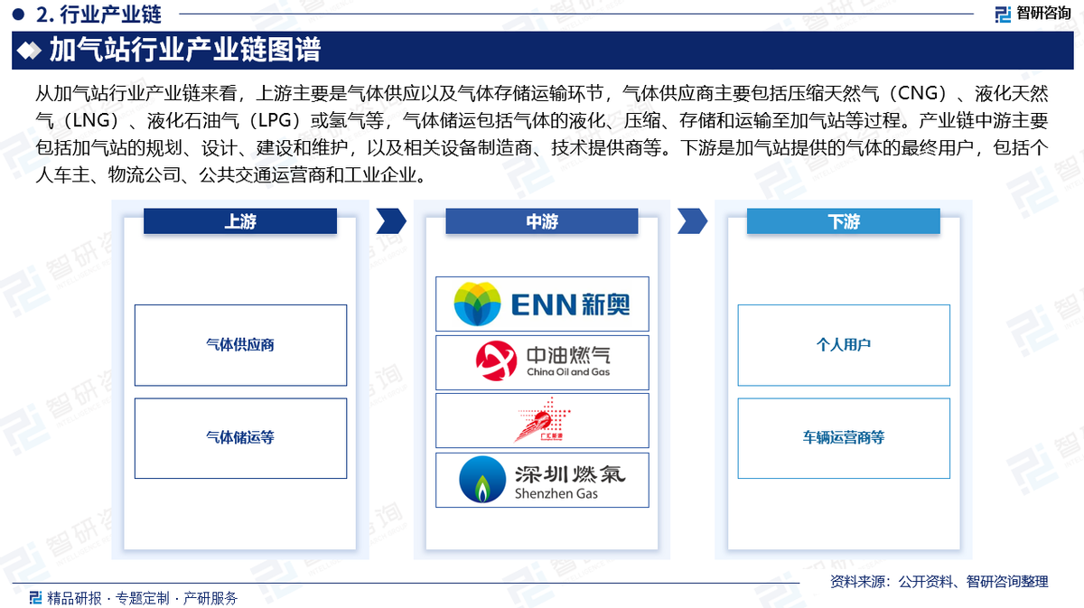 从加气站行业产业链来看,上游主要是气体供应以及气体存储运输环节,气体供应商主要包括压缩天然气(CNG)、液化天然气(LNG)、液化石油气(LPG)或氢气等,气体储运包括气体的液化、压缩、存储和运输至加气站等过程。产业链中游主要包括加气站的规划、设计、建设和维护,以及相关设备制造商、技术提供商等。下游是加气站提供的气体的最终用户,包括个人车主、物流公司、公共交通运营商和工业企业。