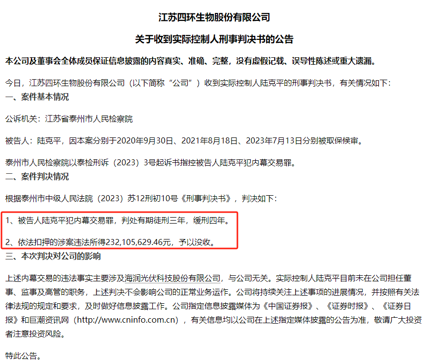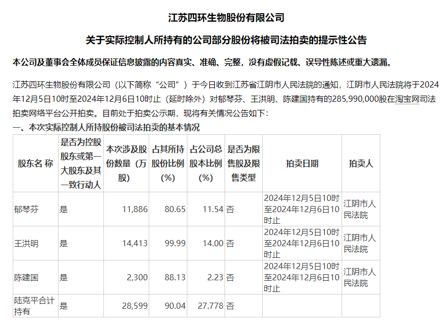 四环生物表示,上述内幕交易的违法事实主要涉及海润光伏科技股份有限公司,与公司无关。实际控制人陆克平目前未在公司担任董事、监事及高管的职务,上述判决不会影响公司的正常业务运作。 值得注意的是,今年10月21日晚间,四环生物公告称当日接到通知,证监会对公司实际控制人陆克平下发了《立案告知书》,因涉嫌信息披露违法违规,根据相关法律法规,证监会于近日决定对其立案。 公司连年亏损 实控人所持大量股份将被拍卖 11月4日晚间,四环生物发布公告,江苏省江阴市人民法院将对公司股东郁琴芬、王洪明、陈建国持有的2.86亿股股份在淘宝网司法拍卖网络平台公开拍卖。公告显示,上述3人所持股份由陆克平控制。 四环生物表示,截至公告日,公司实际控制人陆克平持有公司股份3.18亿股,占公司总股本的30.85%。如本次司法拍卖最终成交,或将导致公司控制权发生变化。