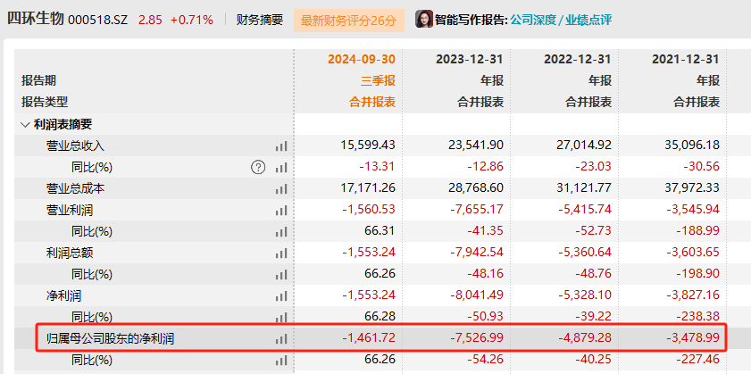 从业绩上看,四环生物自2021年以来持续亏损,今年前三季度归母净利润再度亏损1462万元。