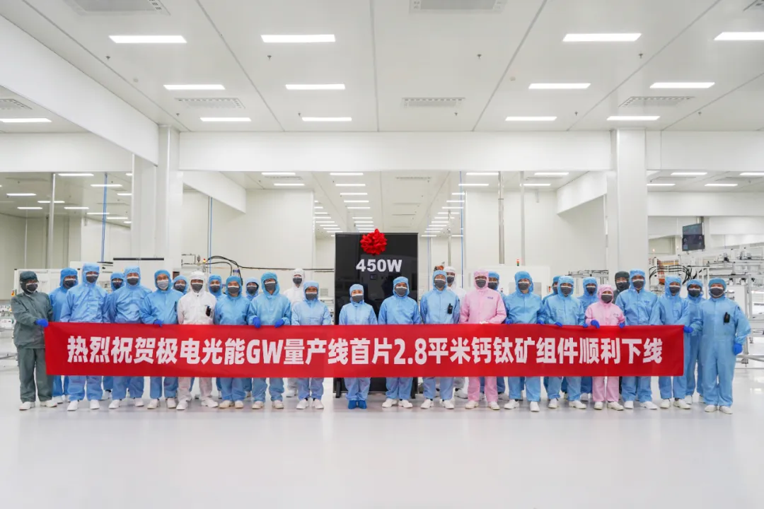 11月5日,极电光能GW量产线调试实现全工序的整线贯通,2.8平米超大面积钙钛矿组件首片顺利下线,组件功率达到450W,全面积效率16.1%,是有史以来面积最大、功率最高的钙钛矿组件。这标志着全球钙钛矿产业化正式迈入GW级规模化量产阶段,将加速钙钛矿光伏组件实现商业化应用场景全覆盖。