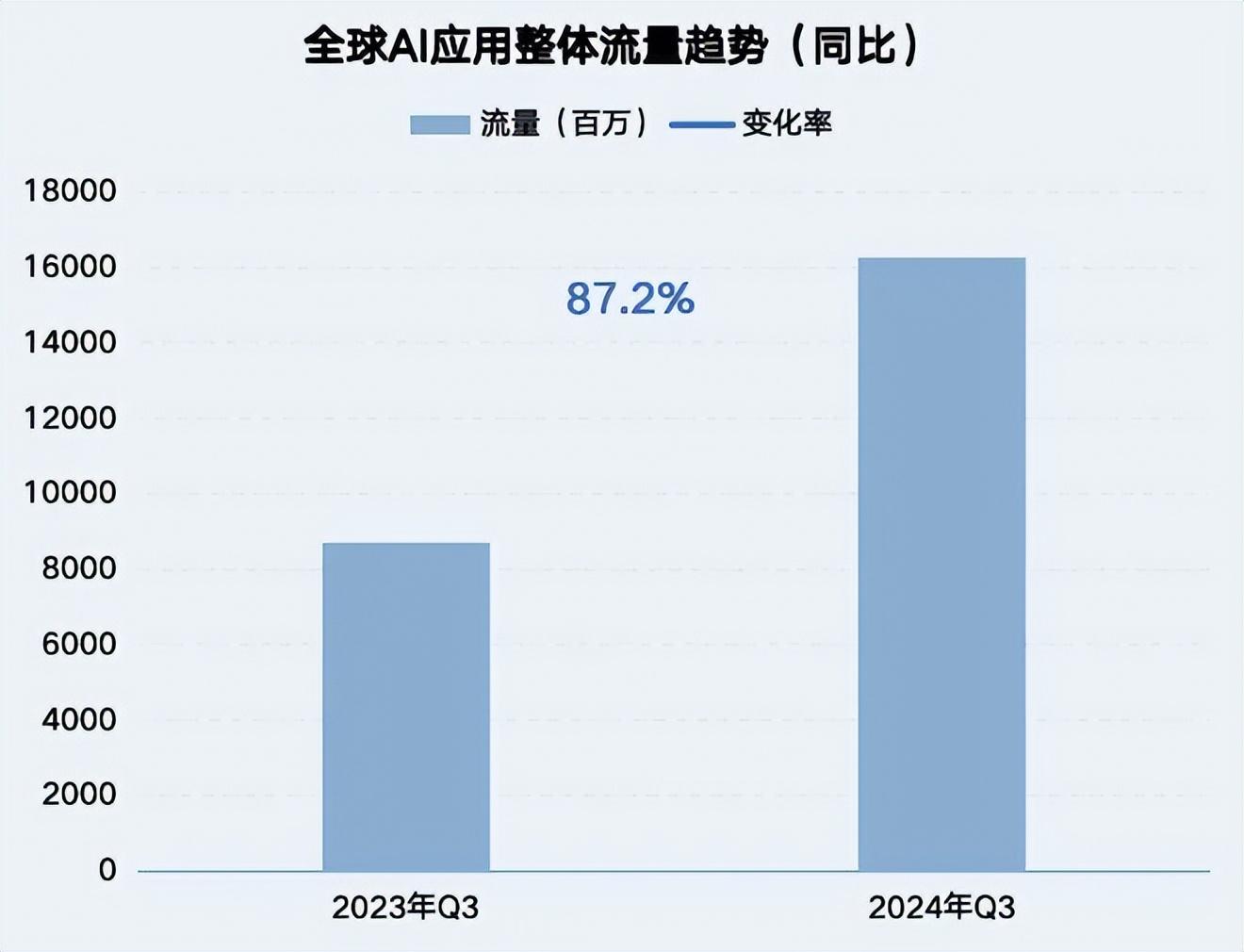 伽马数据发布的人工智能系列报告显示,2024年第三季度,全球AI产品整体流量较去年同期大幅增长87.2%,环比也有1.3%的增长。