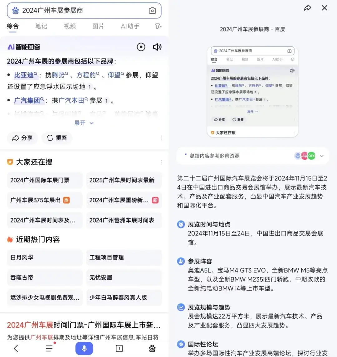 与此同时,百度也在C端同步发力AI。年中更新的“捏一捏”手势,就相当于将一个AI搜索+总结助手,常驻在APP使用的几乎任何环节。无论是面对长文、视频还是搜索结果,用户只需简单在屏幕上做出手势,关键信息就能以直观的内容展示形式快速呈现。