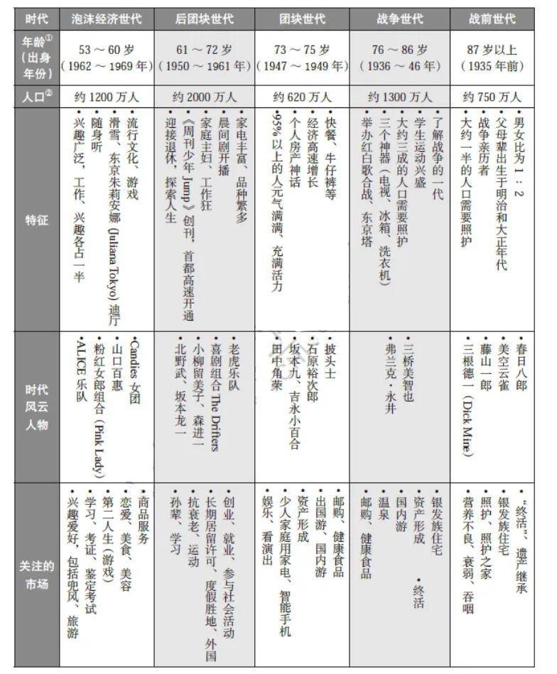 最后就是约有1200万人的泡沫经济世代。他们在53~60 岁,即将步入银发族的行列。他们受流行文化影响,曾在东京朱莉安娜迪厅等地蹦迪。他们较为关注“恋爱”“美食”“美容”和“旅游”等市场。