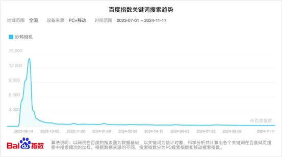以曾经火爆一时的妙鸭相机为例。百度指数显示,妙鸭相机从去年7月17日上线,热度从7月23日开始上升,8月初达到峰值,随后就开始缓慢下滑。根据数据分析公司Sensor Tower统计,大部分头部“AI+图像”应用的生命周期只有两个月。