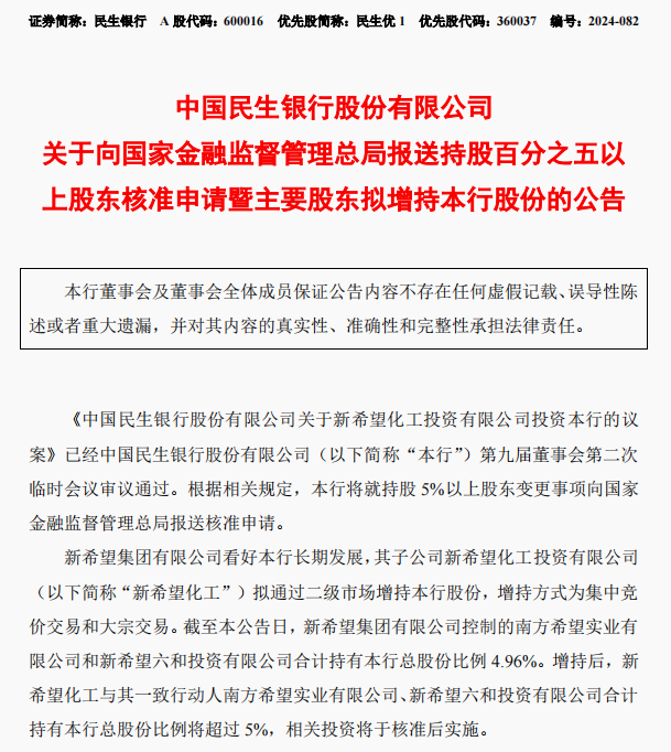 【导读】新希望集团拟举牌民生银行,持股比例将超5%