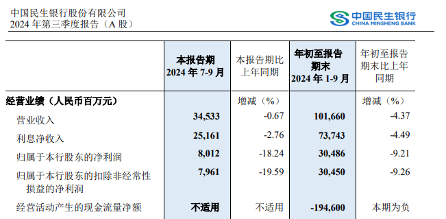 来源:民生银行官网 2024年前三季度,民生银行的营业收入为1016.60亿元,同比下降4.37%;归母净利润为304.86亿元,同比下降9.21%。截至2024年第三季度末,民生银行的总资产为7698万亿元。