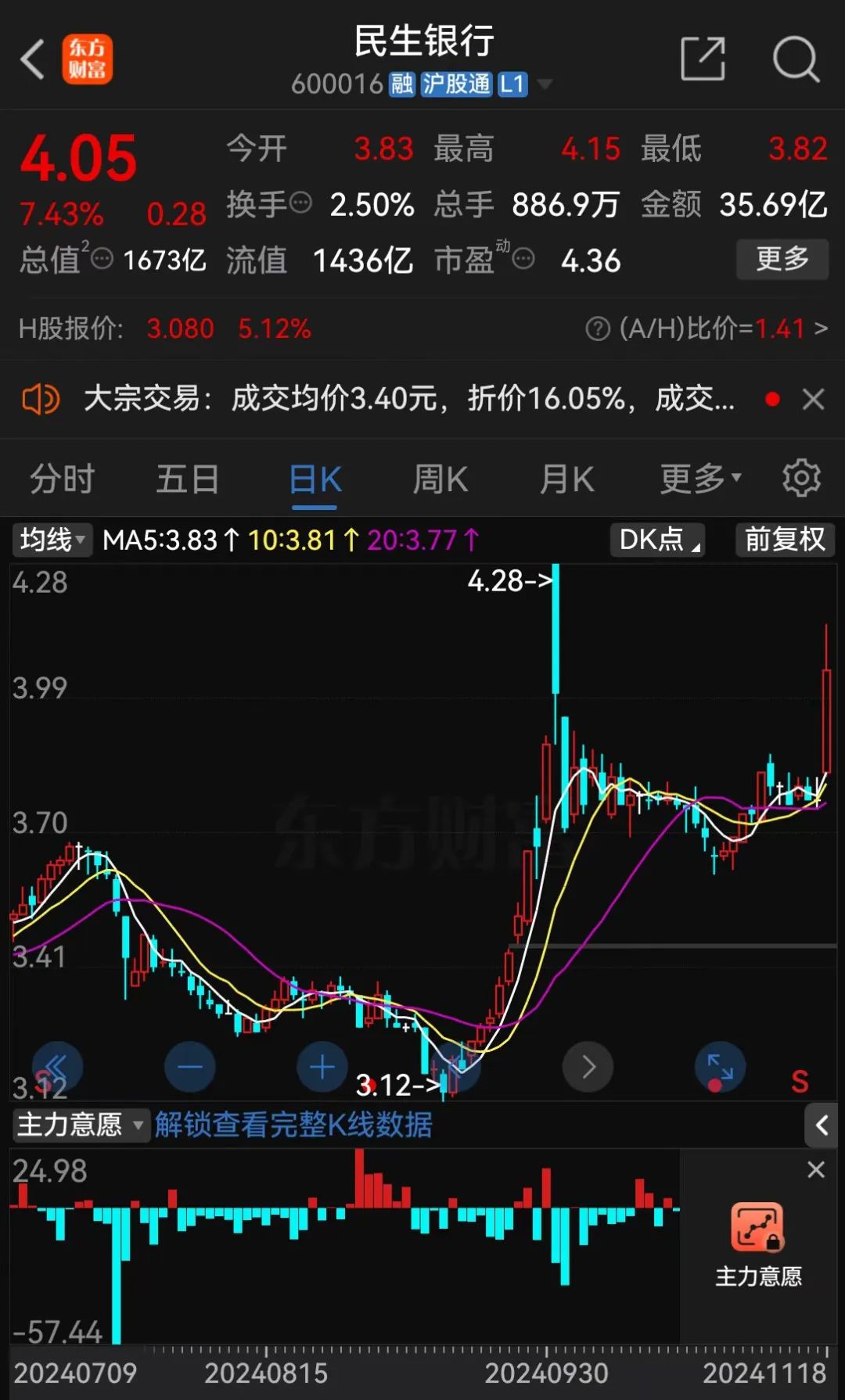 11月18日收盘,民生银行的A股股价报4.05元/股,涨幅达7.43%,总市值为1673亿元;港股股价报3.08港元/股,涨幅达5.12%,总市值为1809亿港元。