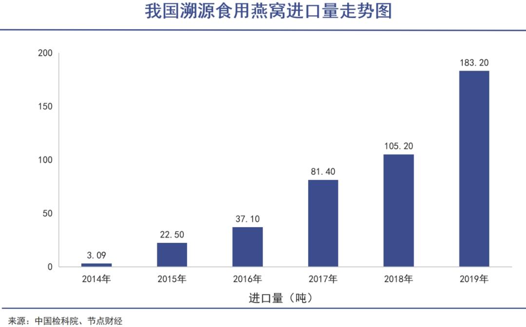 但现代化工艺以及上游产量的提升,让燕窝产业进入工业化阶段,改变了过往局面。据中国燕窝溯源管理服务平台统计,自2013年12月25日燕窝再次获批进口以来,我国食用燕窝每年的进口量由2014年的3.09吨急速攀升到2019年的183.2吨,供应量的提升直接导致燕窝价格十年来接近腰斩。