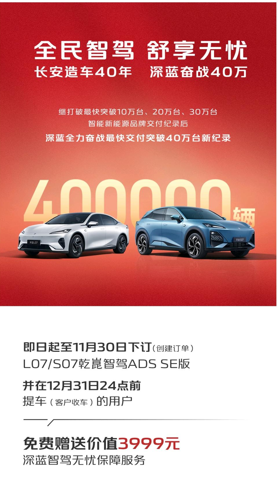 对买深蓝L07和S07华为ADS SE版的用户赠送智驾无忧保险,