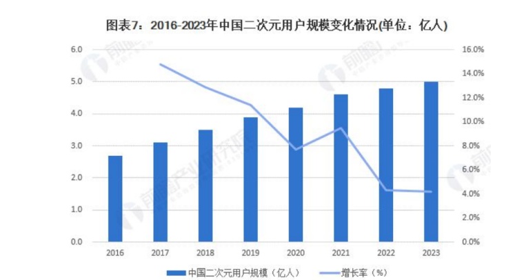 根据前瞻产业研究院数据,2016-2023年,中国二次元产业规模从189亿元增长至2219亿元,复合增速42%;其中周边衍生产业规模从53亿元增长至1023亿元,复合增速高达53%。展望未来,预计2023-2029年,二次元产业规模将从2219亿元增长至5900亿元,复合增速18%。