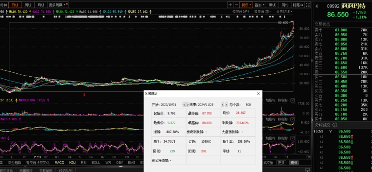 1、龙头:泡泡玛特:昨日创下2021年3月以来的新高,年初至今涨幅超过3.3倍。而且2年上涨超过8倍。海外业务是推动股价上涨的关键因素,第三季度港澳台及海外收益同比增长440%至445%,上半年增速达259.6%。7月份,泡泡玛特在多国开设七家新门店,尤其在东南亚市场表现突出,上半年营收5.6亿元,同比增长478.3%,占比41.1%。(从这里可以看到,不光是内,国内一样火,说明了这个是一个趋势。)