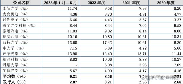 同一时期,晶华光学所处同行可比公司研发费用率均值分别为7.21%、7.49%、8.56%和9.21%,均要明显高于当期晶华光学的研发费用率水平。