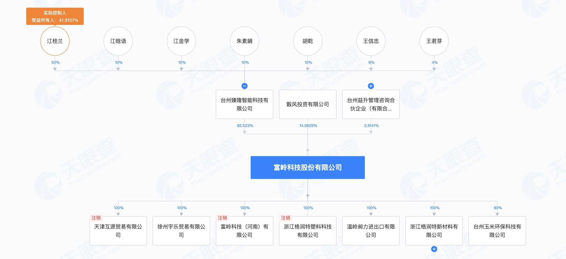 本次上市前,臻隆智能直接持有富岭股份36474.35万股股份,对该公司的持股比例为82.52%,为该公司的控股股东。据招股书介绍,富岭股份的实际控制人为江桂兰和胡乾,合计控制该公司85.44%的股份和表决权。