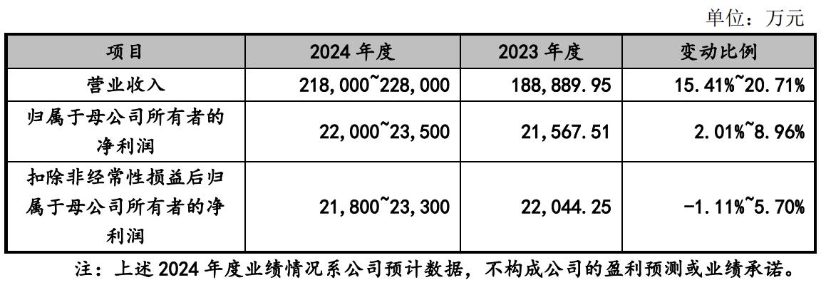 同时,富岭科技预计其2024年的营收约21.8亿元至22.8亿元,同比增长15.41%至20.71%;预计净利润约2.20亿元至2.35亿元,同比增长2.01%至8.96%;预计扣非后净利润约2.18亿至2.33亿元,同比变动-1.11%至5.70%。